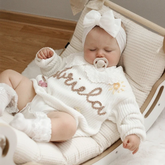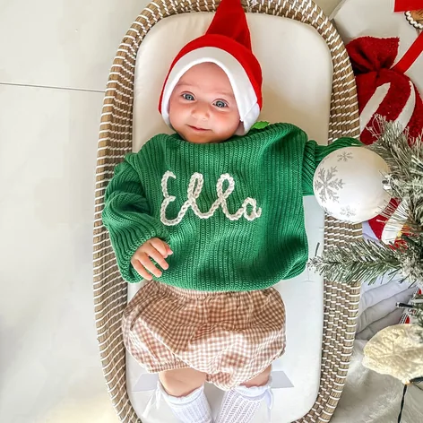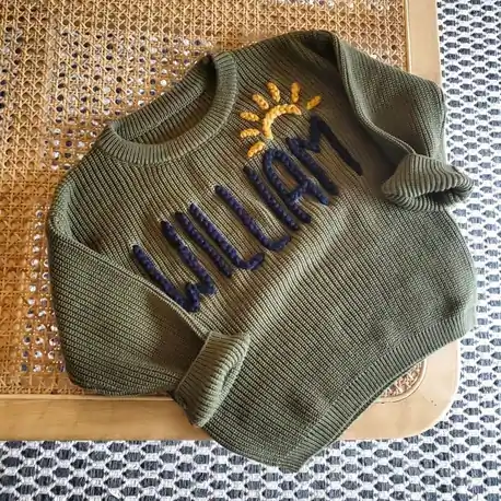 ✅ Exquisite Hand-Embroidered Detail – Each name is stitched entirely by hand, creating a charming, textured 3D look that machine embroidery simply can’t replicate. ✅ Cloud-Soft Organic Cotton – Made from 100% knit organic cotton, it’s exceptionally soft, breathable, and perfectly gentle on a baby’s sensitive skin. ✅ A Picture-Perfect Keepsake – The ideal outfit for milestone photos, holiday cards, family gatherings, or simply making any day a little more memorable. ✅ A Truly One-of-a-Kind Gift – Because it’s hand-embroidered, no two sweaters are exactly alike—just like the precious little ones who wear them. ✅ Quick Processing, Unlimited Revisions – We create your design quickly and let you see it before we stitch, offering unlimited revisions to ensure you love it.